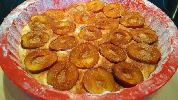 Сверху укладываем плотно половинки слив срезом вверх. В этом моменте иногда еще поливают соком лимона. Я пробовал. Изменения во вкусе не ощутил. Теперь не поливаю.