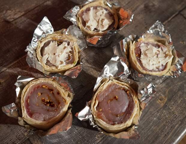 Шайбы упёхал в фольгу. Почесал репу и сверху тож промазал каймаком.