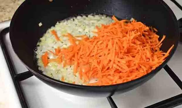 Теперь добавим в нему морковь и потушим вместе минуты три. Сразу же загружаем эту массу в кастрюлю с варящейся картошкой.