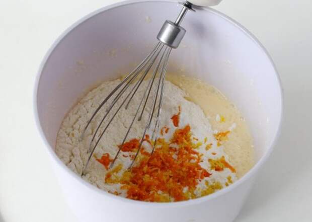 Добавляем разрыхлитель, цедру цитрусовых, муку. Перемешиваем.