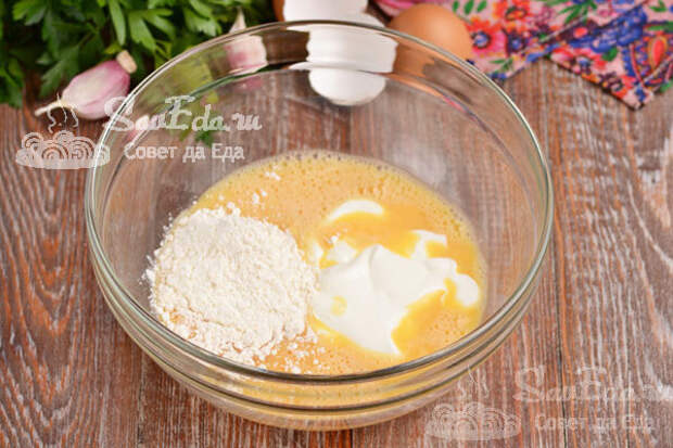 Добавляем сметану (3 ст. л.), муку (2 ст. л. с горкой), немного солим и перемешиваем.
