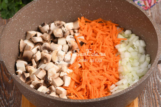 Фрикадельки вынимаем, добавляем в кастрюлю нарезанные шампиньоны (200 г), репчатый лук (1 шт.) и крупно натертую морковь (1 шт.).