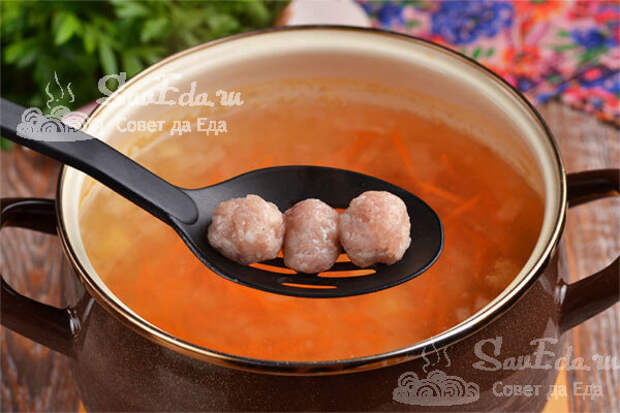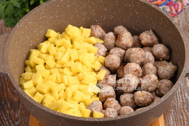 Затем в овощи с грибами выкладываем обжаренные фрикадельки и нарезанный на небольшие кубики картофель (3-4 шт.). Заливаем большим количеством воды (контролируем густоту супа), солим, перчим и готовим, пока картошка не станет мягкой.