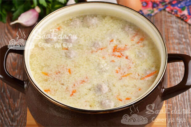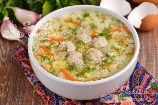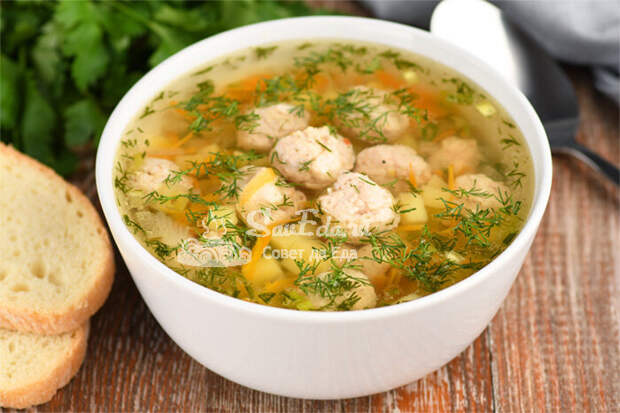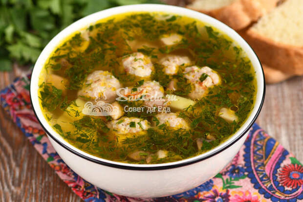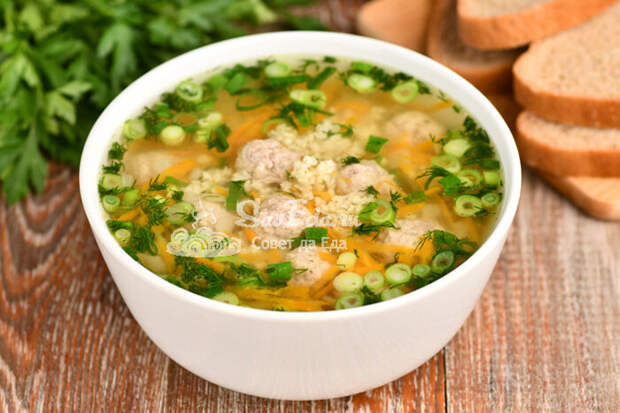 Готовый суп с фрикадельками разливаем по тарелкам и сразу подаем на стол. Он легкий, ароматный и очень вкусный. Суп не очень густой, за счет пшена получается сытный.