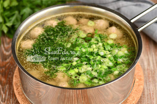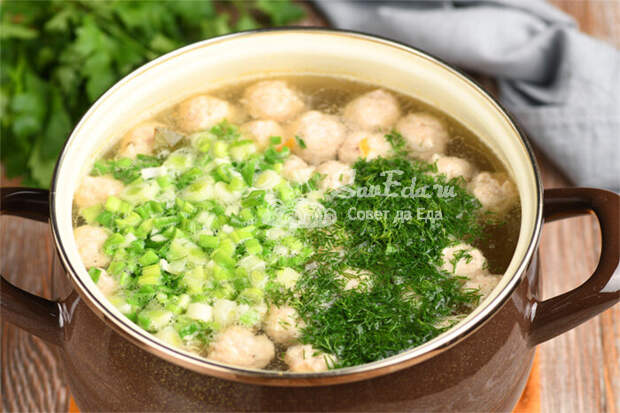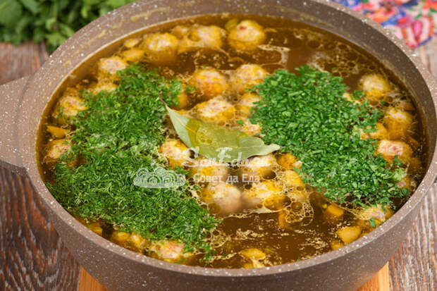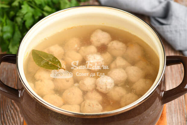 Отправляем фрикадельки в кастрюлю, добавляем лавровый лист и варим на медленном огне около 15 минут. Овощи я не обжариваю, из фарша выделяется жир, которого достаточно. Если хотим получить более жирный вариант супа, то лук с морковью обжариваем в масле. Суп дополняем нарезанной зеленью (укроп, зеленый лук), пробуем на соль и снимаем с огня.