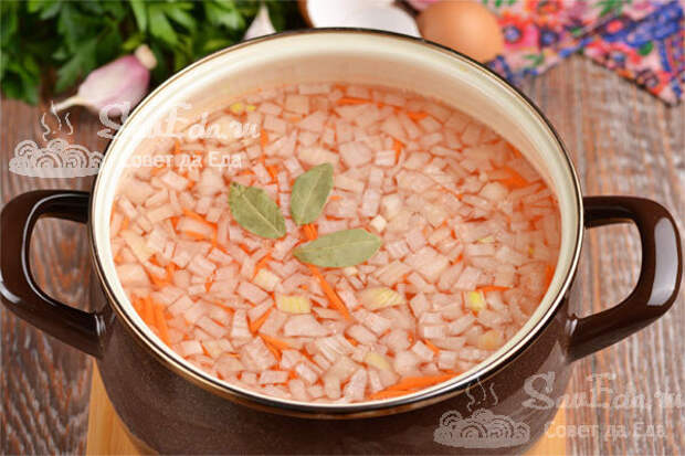 2. Суп с фрикадельками и яичной смесью. Овощи среднего размера. Картофель (4 шт.) и репчатый лук (1 шт.) нарезаем мелко, морковь (1 шт.) натираем крупно и отправляем в кипящую воду (около 2 литров, объем кастрюли 3 литра). Дополняем лавровым листом, солью. Доводим до кипения, снимаем образующуюся пену и перчим. Готовим на слабом огне 10-15 минут.