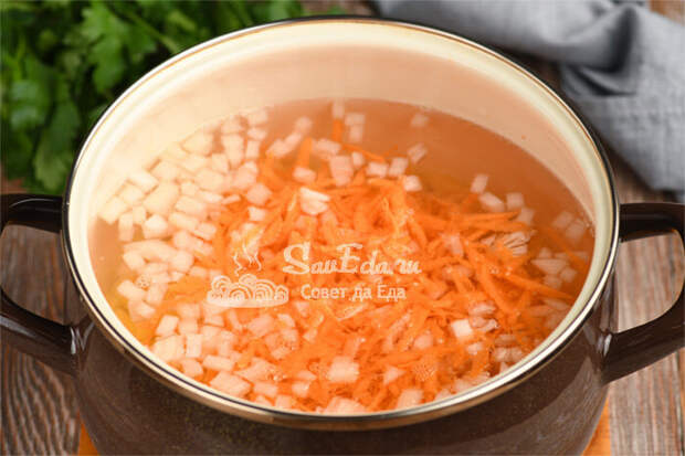 Сразу добавляем промытое пшено (2 ст. л. с горкой) и варим на медленном огне около 20 минут.