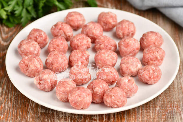 Фарш (350 г, у меня свинина и курица) дополняем солью, перцем и перемешиваем. Формуем небольшие фрикадельки (у меня получилось 39 шт.) и отправляем в кастрюлю. Варим после закипания 5-7 минут.