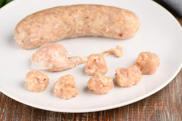 Пока варятся овощи, отсоединяем колбаски друг от друга. Часть колбаски зажимаем между большим и указательным пальцем и выдавливаем небольшое количество фарша. Получаются небольшие округлые фрикадельки. Из одной колбаски выходит 19-20 фрикаделек (из 2 колбасок у меня получилось 39 шт.).