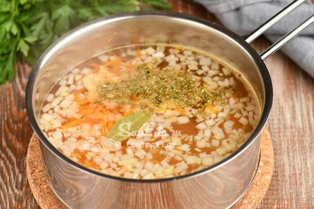 ), любимые специи (у меня 1 щепотка сухой смеси аджика) и небольшой лавровый лист. Овощной бульон должен насытиться пряностями. Варим на медленном огне, пока подготавливаем фарш.