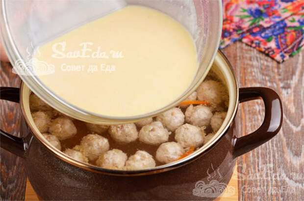 Яичную смесь еще раз перемешиваем венчиком и сразу всю выливаем в кастрюлю. Перемешиваем суп.