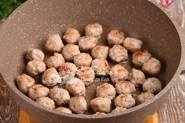 4. Суп с фрикадельками и грибами. Любой фарш (у меня свиной 400 г) дополняем измельченным луком, солью, молотым перцем, перемешиваем и формуем маленькие фрикадельки (у меня 37 шт.). В кастрюле с толстым дном или жаровне объемом 3 литра на растительном масле (2 ст. л.) обжариваем фрикадельки, пока не зарумянятся.