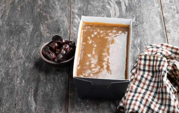 - В глубокую емкость влейте кокосовое молоко. Добавьте очищенные финики. Перебейте их блендером до однородности.