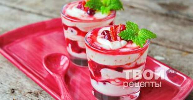 7 Уложить парфе в бокалы слоями, чередуя клюквенно-апельсиновый мармелад и взбитый сыр. Парфе сильно охладить и подавать, декорировав свежей мелиссой.