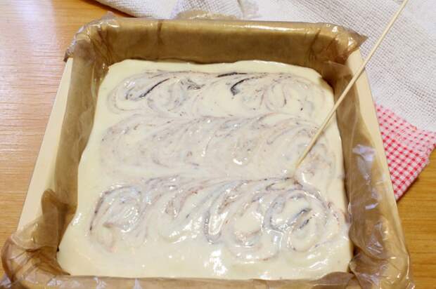 - С помощью деревянной шпажки проводим разводы произвольного орнамента, декорируя двухслойный пирог. Выпекаем при температуре 180 градусов в раскаленной печи порядка 30 минут.