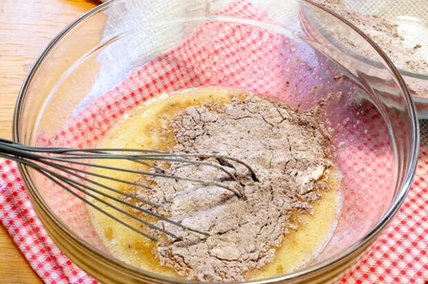 - Затем вливаем растопленный шоколад и масло — замешиваем вязкое шоколадное тесто.