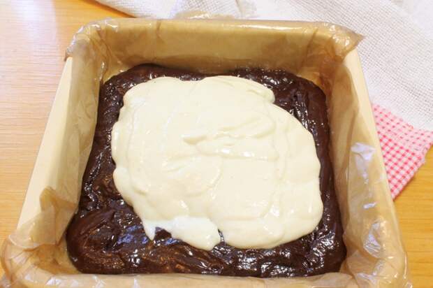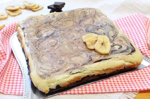 - Переливаем бананово-творожную массу, покрывая шоколадный слой.