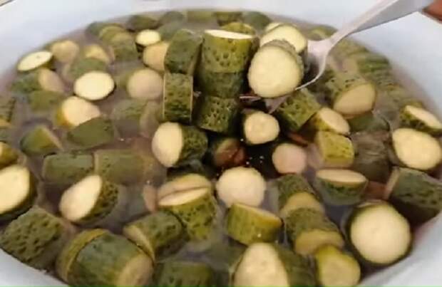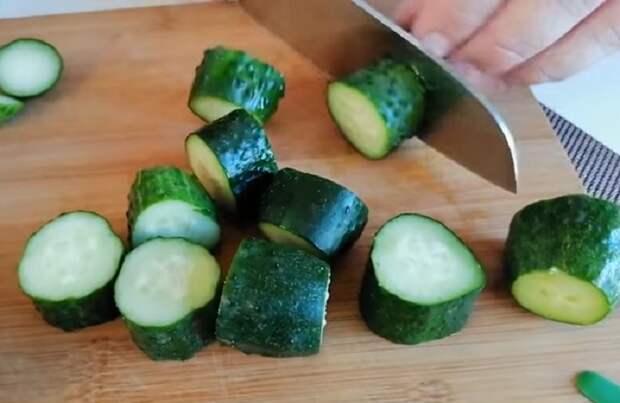 - Пока это происходит, огурцы следует вымыть и нарезать "бочоночками". Размер выбирайте сами.