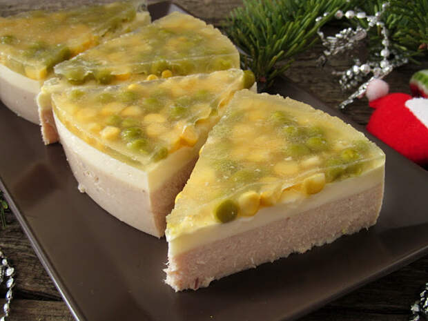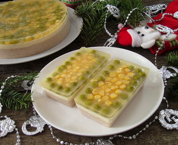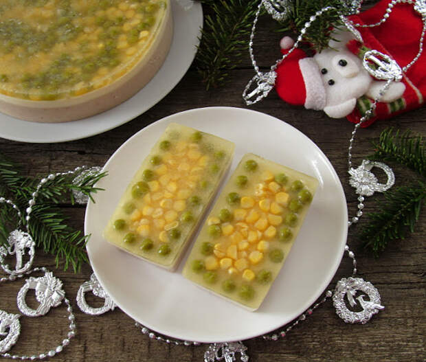Когда майонезный слой застынет, выложить сверху декор. Здесь "полет" вашей фантазии))) Я готовила на скорую руку, поэтому с декором не заморачивалась, а просто разложила горошек и кукурузу.