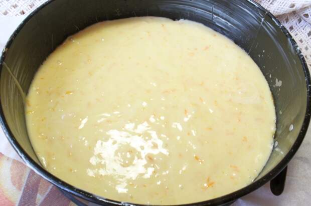 - Равномерно распределяем мучную массу по всей форме и ставим на 25 минут в заблаговременно разогретую печь. Выпекаем наш ароматно-освежающий пирог при температуре 190 градусов.