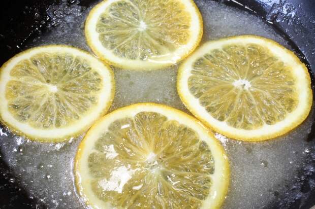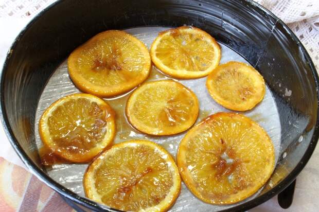 - Крупный апельсин, вымыв, высушив, нарезаем кругами, аккуратно удаляем возможные косточки. На сковороде растапливаем брусок сливочного масла и 50 г сахар — погружаем в пенную смесь фруктовые кусочки и карамелизируем с обеих сторон по 1-1,5 минуты. Перед формовкой пирога фрукты кладем на смазанную жиром плоскую тарелку, чтобы они не прилипли к поверхности.