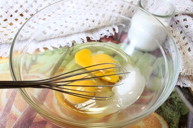 - Вбив в просторную посуду, яйца энергично перемешиваем вилкой или венчиком со 150 г сахарного песка — достаточно добиться соединения компонентов.