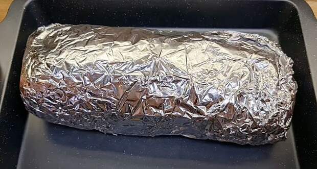 4. Аккуратно заверните все в рулет, используя фольгу. Переложите рулет в разогретую до 180 градусов духовку и запекайте в течение 50 минут.