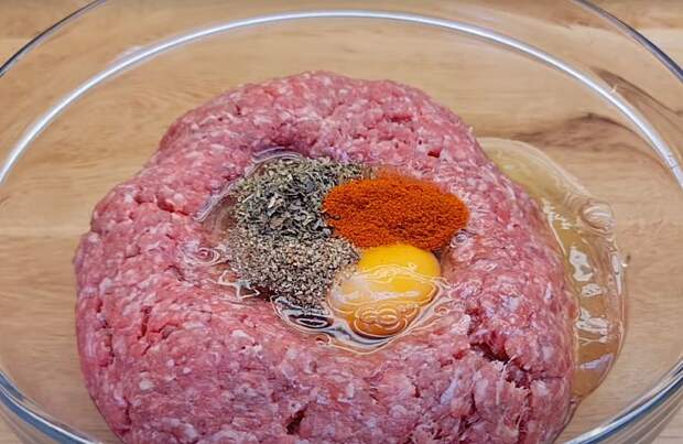 1. В глубокой миске соедините фарш с двумя яйцами.