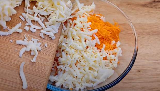 Добавьте соль, перец, базилик и тщательно перемешайте.2. Мелко нарежьте луковицу, натрите морковь на мелкой терке, а твердый сыр на крупной. Все положите в отдельную миску, затем все ингредиенты хорошо перемешайте.