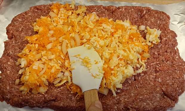 3. Разложите фарш на фольге, равномерно распределите его по поверхности. На верх фарша выложите приготовленную смесь из лука, моркови и сыра.