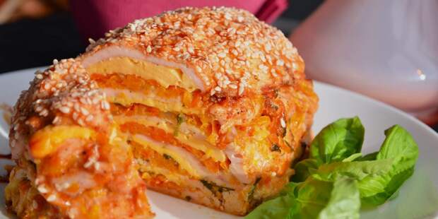 Безупречное, вкусное и красивое сочетание слоёв из мяса, обжаренной моркови с луком и расплавленного сыра.