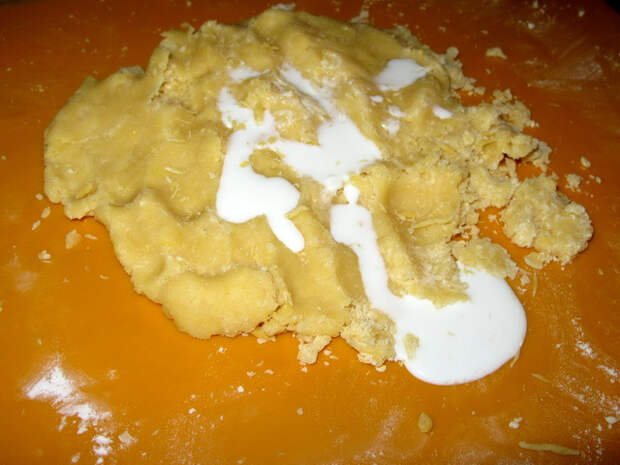 Добавьте молоко и перемешайте, чтобы тесто начало собираться в ком, разотрите тесто до однородности,