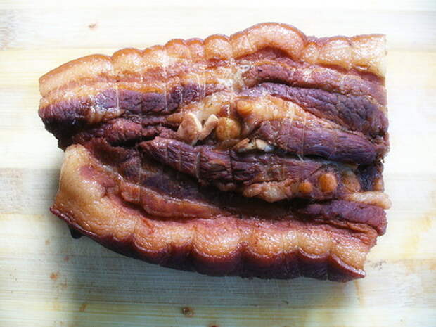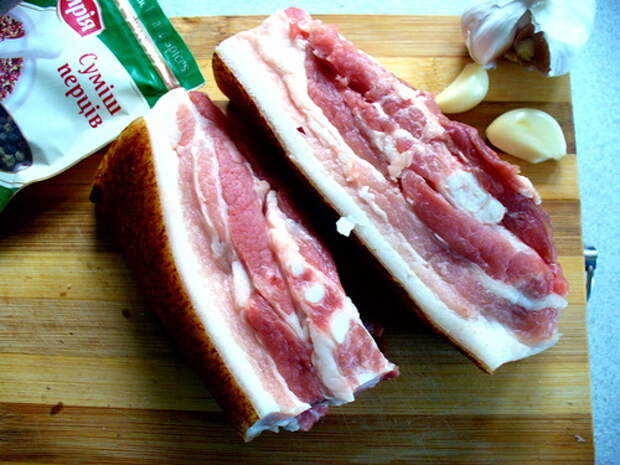 .. , и это против меня... Только я ж из Украины!..национальный продукт надо есть!...надо так надо... ;-) выбираю такой своеобразный компромисс...вареное сало...как ни странно это звучит, ещё и в луковой шелухе :-) по внешнему виду очень похоже на аппетитное копчёное с янтарной корочкой...а если в рассол добавить жидкий дым, то и по вкусу...и такое ароматное, мягкое с дымком... Для этого подойдёт любое сало, однако лучше использовать с мясной прослойкой (корейку, подчеревок, может даже брюшину или щеку) Шкурка обязательна!Чеснок пластинками