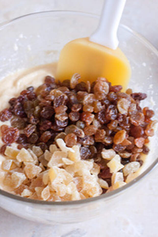 В масляно-яичную смесь добавьте изюм и цукаты.