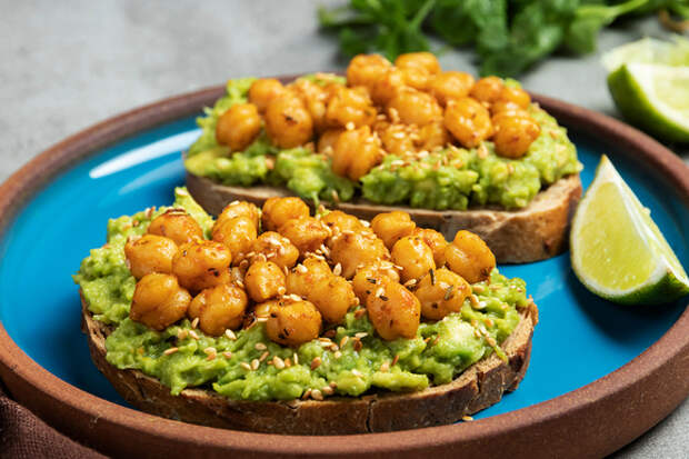 - Подсушенный хлеб смажьте пастой из авокадо и дополните бутерброды хрустящим нутом.