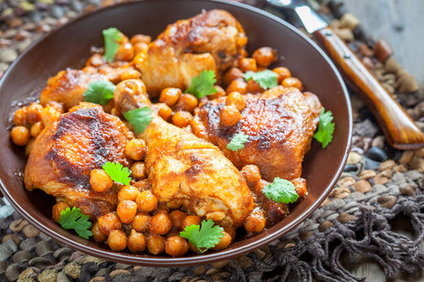 - Отдельно обжарьте курицу до золотистости со всех сторон и выложите к томатной пасте с луком. Туда же добавьте отваренный нут.