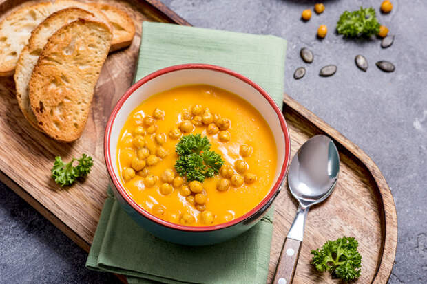 - Подавайте суп-пюре с ароматными травами, тыквенными семечками, горсткой нута или гренками.