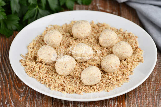 4. Остатки орехов (30 г) высыпаем на тарелку. Из сырно-ореховой смеси формуем небольшие шарики (руки в воде не смачиваем), обваливаем их в орехах и еще раз скатываем между ладонями. Получается 18 сырных шариков.