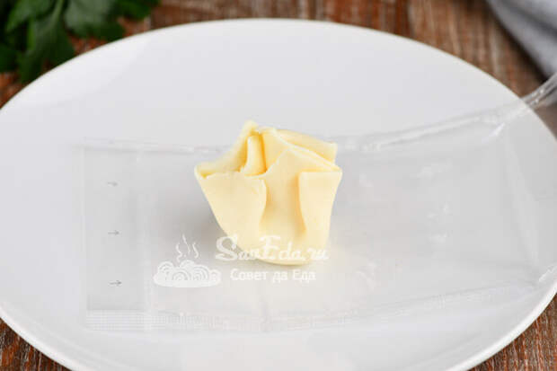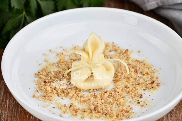 8. Прижимаем ближе к верху и получаются сырные мешочки. Обвязываем их тонкими нитями сыра косичка. Чтобы мешочки не прилипали к тарелке, ставим их на измельченные грецкие орехи (их нужно очень мало), не прижимаем, излишки убираем пальцами.