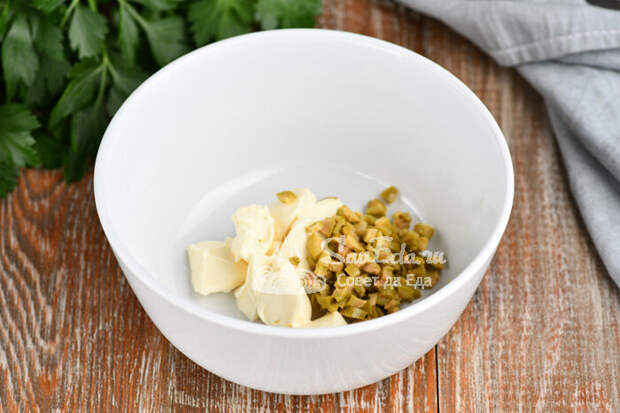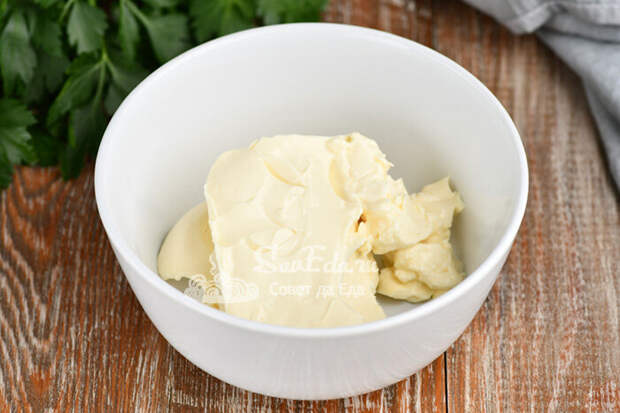 1. Для первой закуски в миску выкладываем пастообразный плавленый сыр.