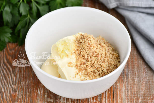 2. Дополняем сыр измельченными грецкими орехами (40 г, измельчаю в ступке) и мелко натертым чесноком.