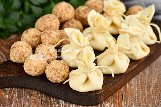 9. Готовые сырные закуски размещаем на тарелке или сервировочной доске и подаем на стол. Их можно разместить с другими сырами, получится оригинальная и очень красивая сырная тарелка. И мешочки, и шарики нежные с замечательным вкусом.