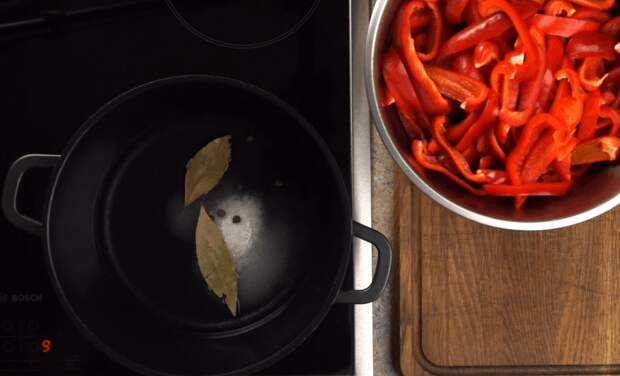 Подготавливаем маринад из воды, уксуса, соли, сахара с добавлением лаврового листа и душистого перца. Доводим его до кипения, убавляем огонь и отправляем туда нарезанный перец на 15 минут. Если жидкость не покрывает перец, делим его на несколько партий.