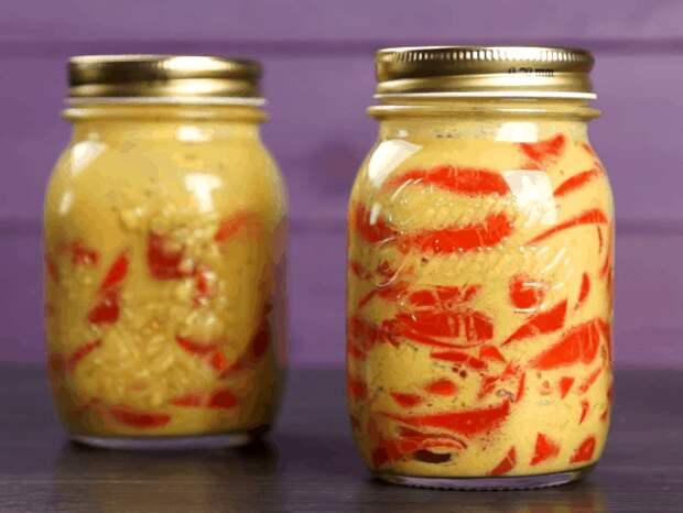 Достаем перец из маринада, даем ему немного остыть, а затем отправляем в горчично-масляную массу, хорошо перемешиваем и раскладываем в стерильные банки.