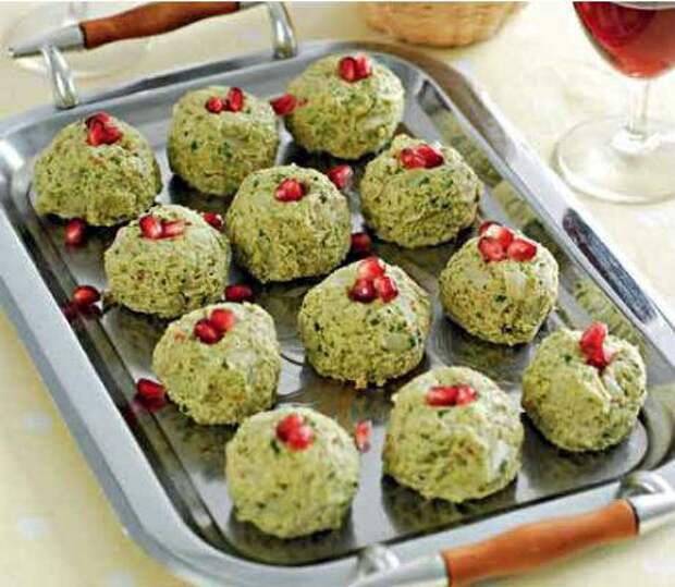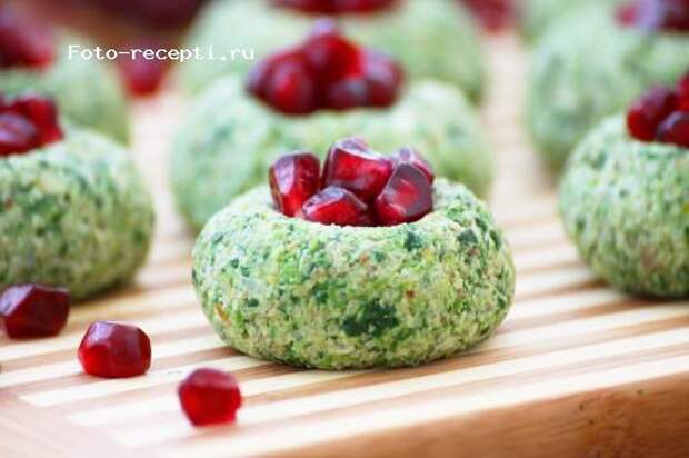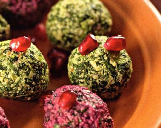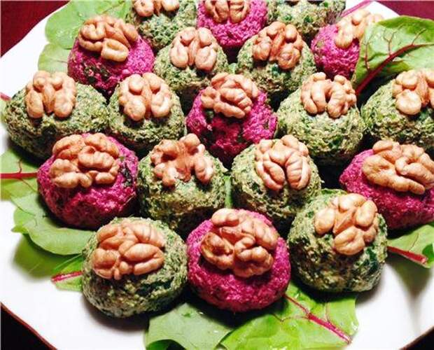 Технология приготовления: 1.Основной овощ - свёкла или спаржа или капуста или баклажан - отварить (свеклу и баклажаны предпочитаю запекать) или бобы - отварить: 2. травы - шпинат, мангольд, свекольная ботва, крапива(что угодно) - бланшировать, после чего отжать(не до конца); 3.Соус - острый перец, грецкие орехи, чеснок, (кто-то лук репчатый) кинза, молотый кардамон, хмели-сунели + винный уксус(по вкусу). 1+ 2+3 - соединить, сформовать шарики или просто уложить в блюдо, посыпать зернами граната, на холод - и вуаля.