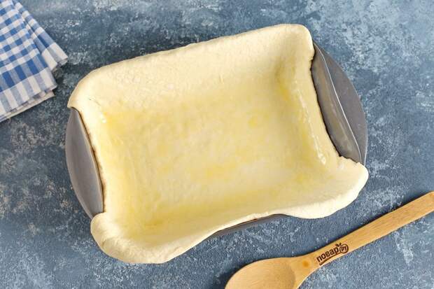 Тесто должно быть больше, чем форма для запекания и концы должны немного свисать. Смажьте тесто растопленным сливочным маслом.