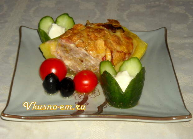 За 5-7 минут до окончания запекания противень с кабачками достать. Положить сверху на бекон оставшийся сыр, который на горячем беконе сразу начнет плавиться, а на сыр выложить кукурузные хлопья, в виде чешуи. Чем больше хлопьев положите, тем больше будет хруста при поедании блюда. Впрочем, потому и назвал блюдо - "Хлопуша"...