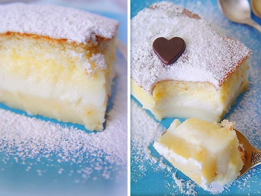 Тому, кто ещё не встречал такого чудо-пирожного, объясним почему оно так называется. Все ингредиенты смешиваются, получается очень жидкое тесто, но в духовке оно «умным» образом расслаивается, и у вас получается торт с кремом посредине. Расслоение происходит за счет разной жирности составляющих.